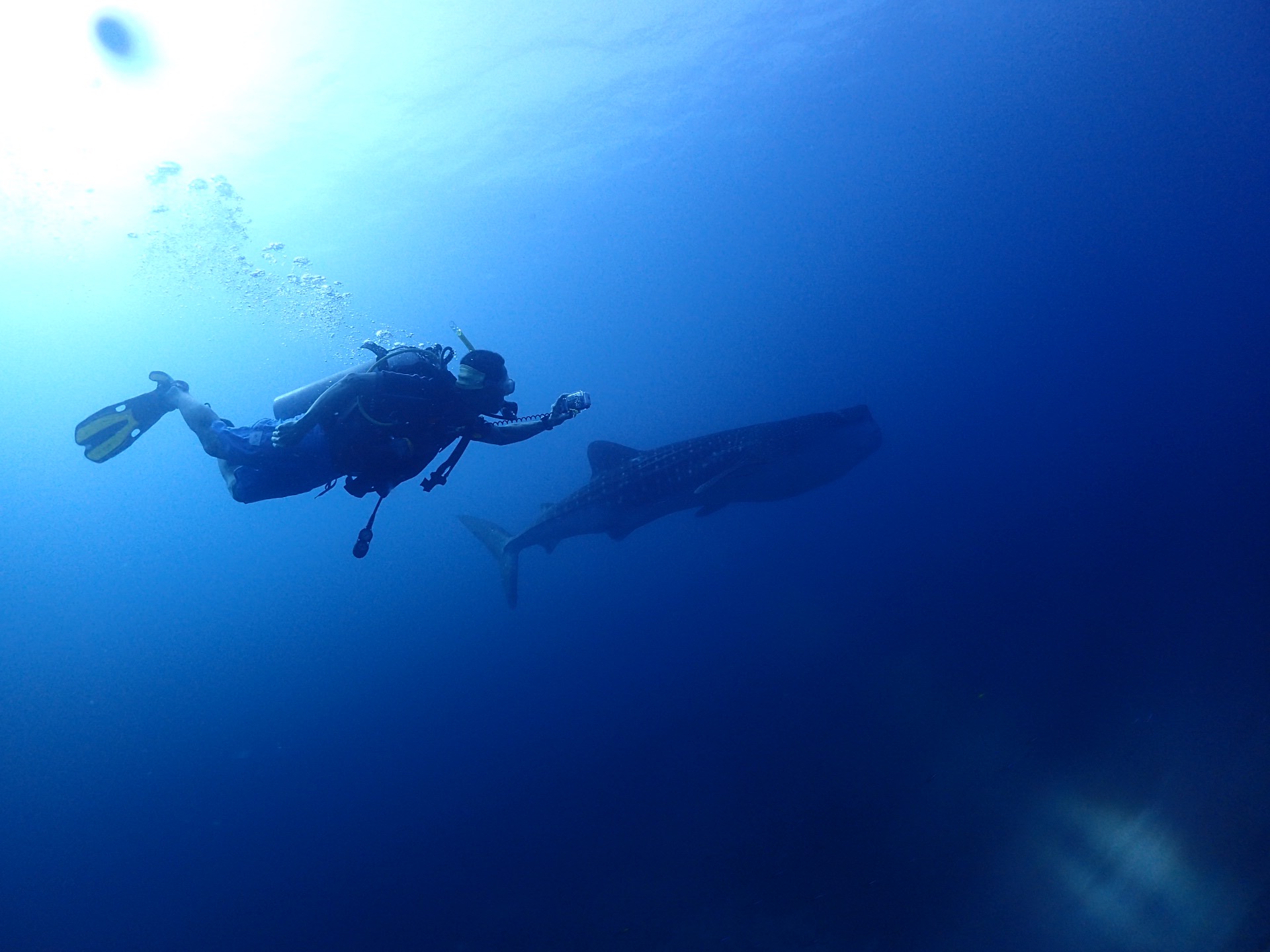3本目はタチャイピナクル。ブラックフィンバラクーダの群れが出迎えてくれました。バラクーダ満喫の後、、出たーーーっ!!はい、ジンベエザメ来てくれました。ゲストさんも初めてのジンベエということで大興奮!!一度去ってしまったのですが、安全停止の際に再び遭うことができました。