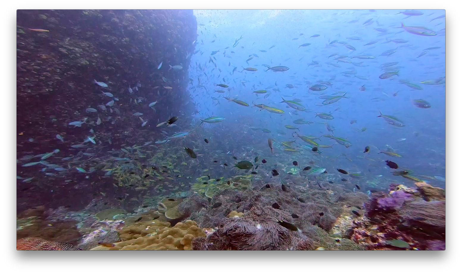 サンセットダイブでは、期待していたアンダマンアジの大軍がおらず、ギンガメアジも散らばっていましたがフュージュラーの量がものすごく、アジに追われてフュージュラーが目の前を行ったり来たりする迫力あるシーンを見ることができました!