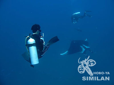今回のクルーズはお腹いっぱーいというくらいマンタ!11ダイブ中、5ダイブはマンタ、マンタ、マンタ!ボン島とタチャイピナクルは、6,7枚のマンタがいて、マンタがいるよ〜と教えてあげようと思うとすでに違うマンタを見てたり。しかも大きなロウニンアジを連れていました。