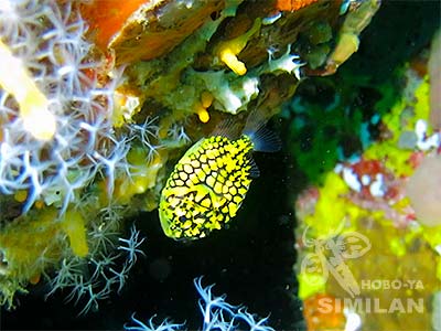3日目は、大物を 期 待しつつ、早朝から丸1日、4本続けてリチェリューロックへエントリー。1本目は、思いのほか流れが強くし尾上に潜行するのに苦労しましたが、ギンガメアジの 群やピックハンドルバラクーダの群れ、タイでは珍しい、マツカサウオの幼魚などを観察できました。!