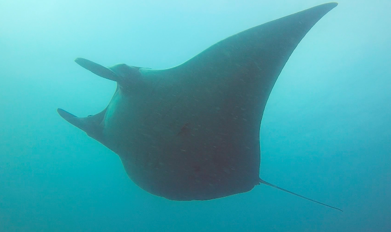 初日1本目ボン島のウェストリッジでまずチェックダイブ。ほとんど流れのない穏やかな海の中で肩慣らしにリッジの北側にある湾内を泳いでいた時でした。マンタがリッジ沿いに深場から急上昇して来ました。初回からいきなり大物を引くとは予想外。