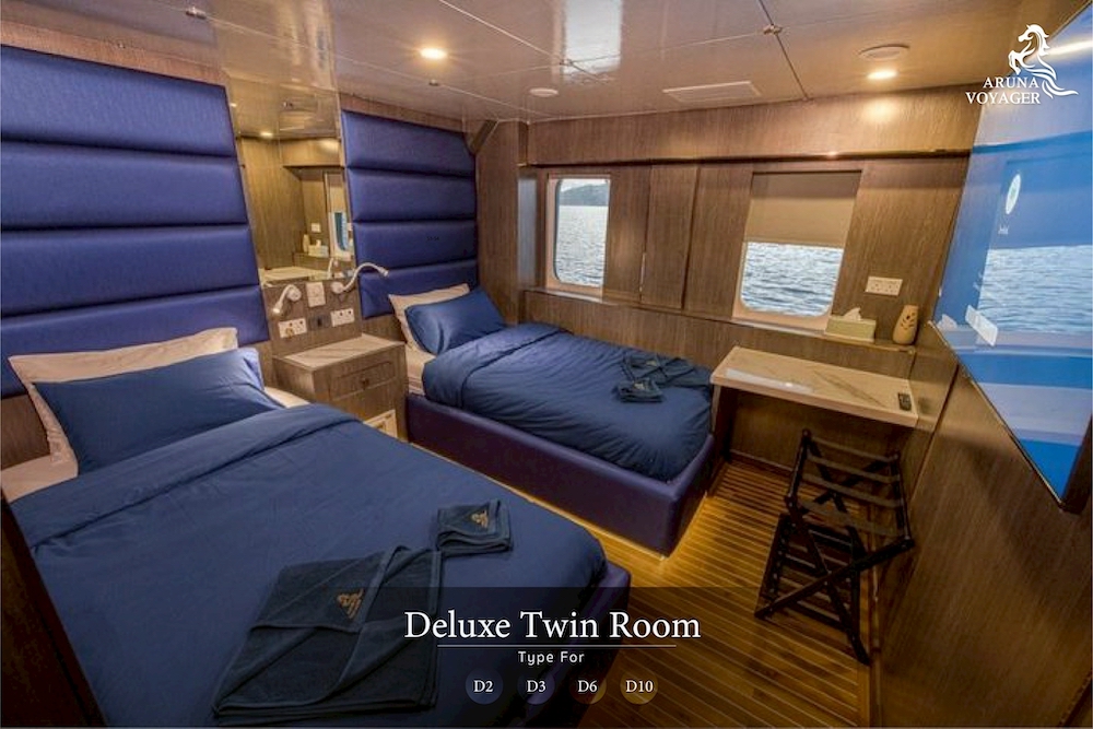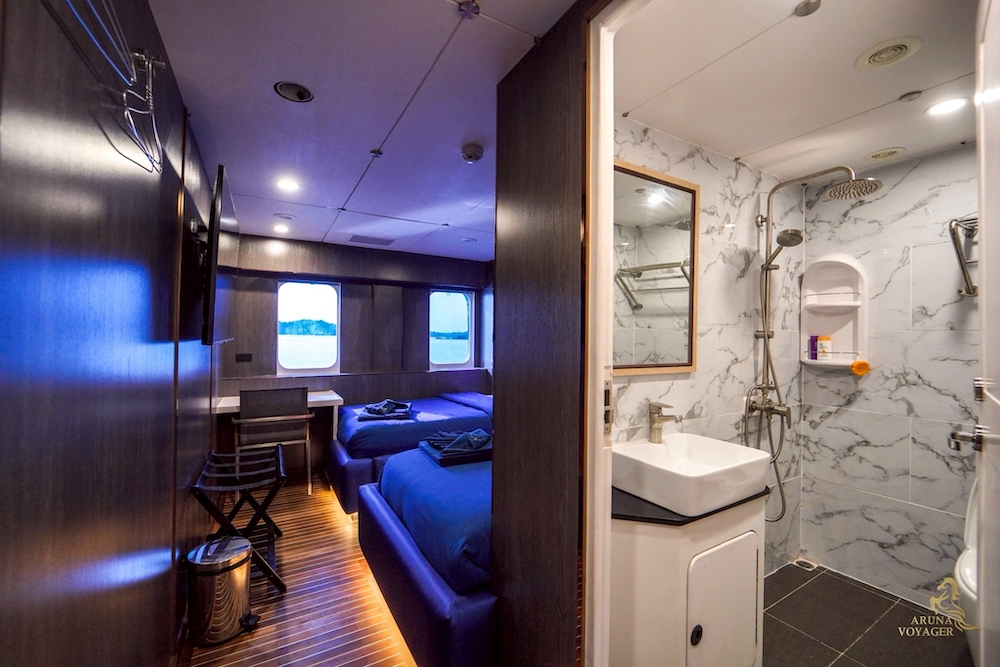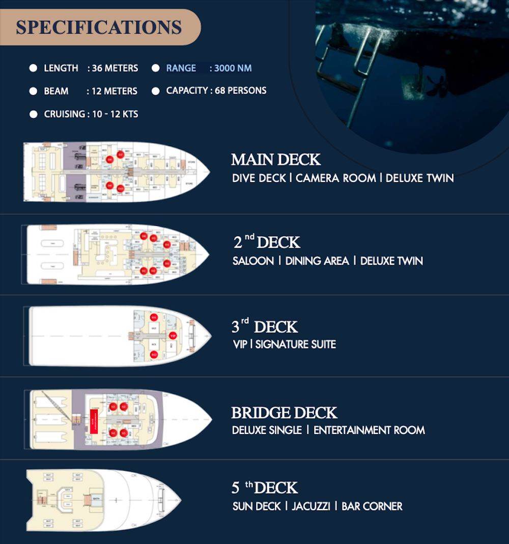 アルーナは全長約36メートル、幅12メートル、5階建ての大型ダイブクルーズ船で、最大定員は30名です。船内には広々としたエアコンサロンやオープンデッキ、サンデッキなど快適な共有スペースを完備。全キャビンにはシャワー・トイレと、明るい自然光が差し込む窓が設置されています。ナイトロックス対応のほか、カメラ専用スペースや充電ステーション、広めのダイブデッキなど、ダイバーに嬉しい設備が充実。個人旅行にも便利なシングルキャビンもご用意しています。
