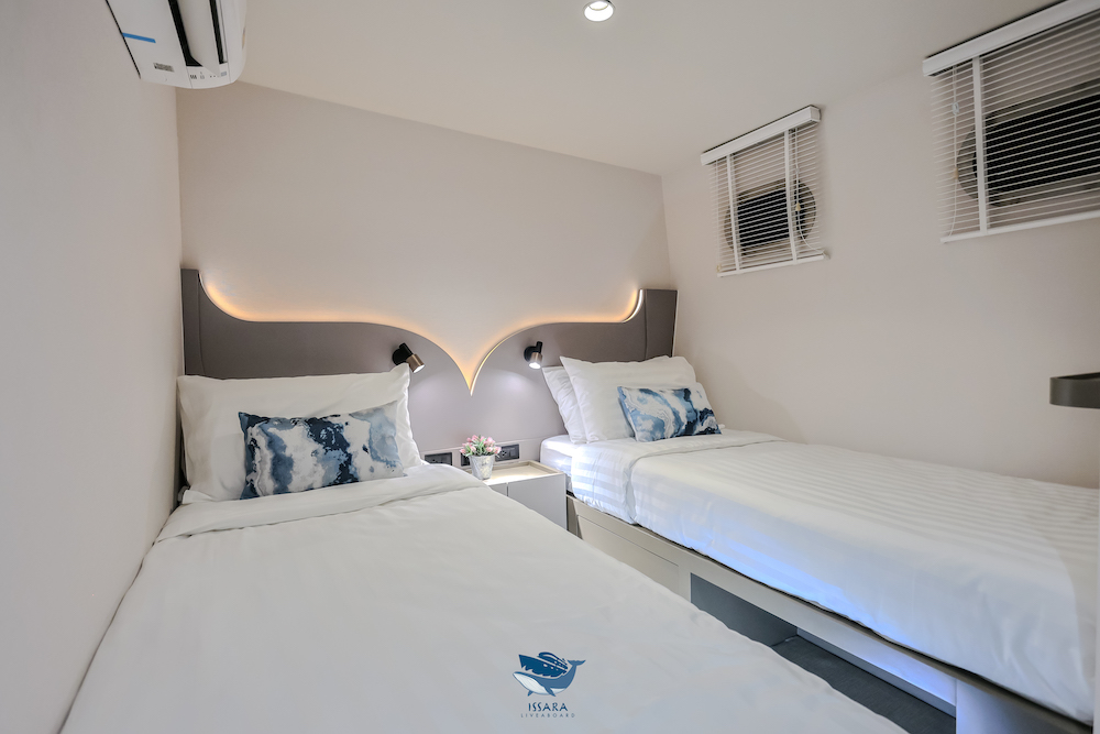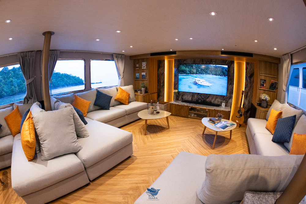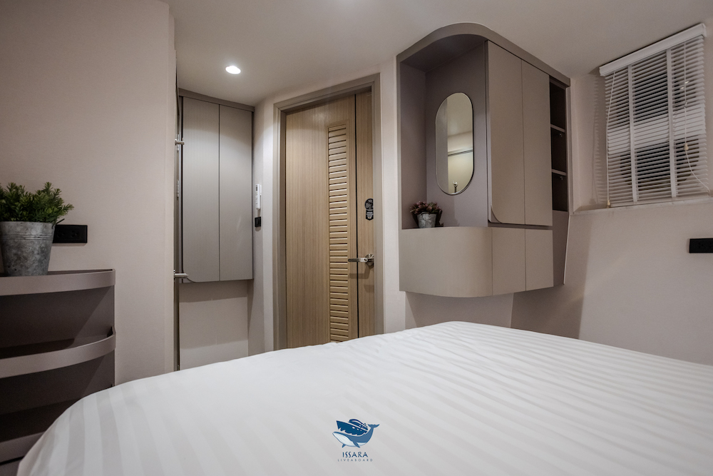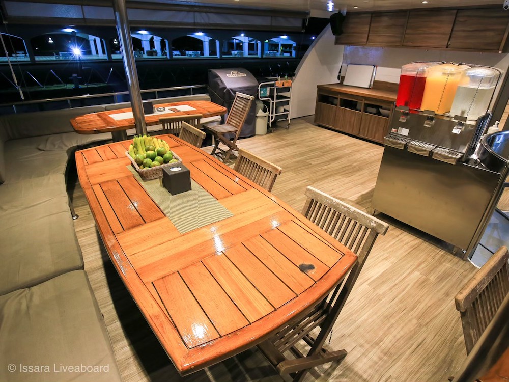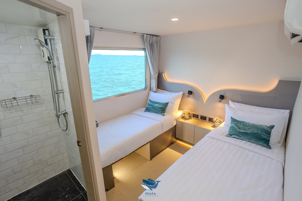 イッサラは全長28メートル、22名定員の大型クルーズ船です。船内は、エアコンサルーン、オープンエアデッキ、サンデッキなど広々とした共有スペースを確保。清潔感のある室内はすべてトイレ・シャワールームを完備しています。一般的なダイビング設備に加え、ナイトロックスタンク充填設備も完備しています。最新のスターリンク(衛星インターネット)を搭載しており、洋上でも安定した通信環境が利用可能です(有料)。