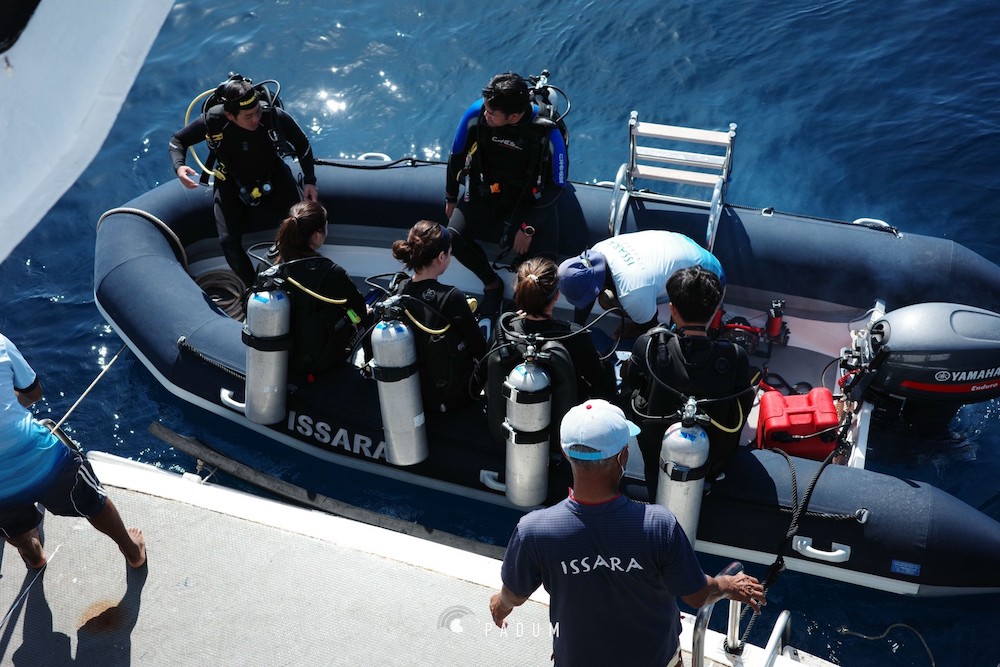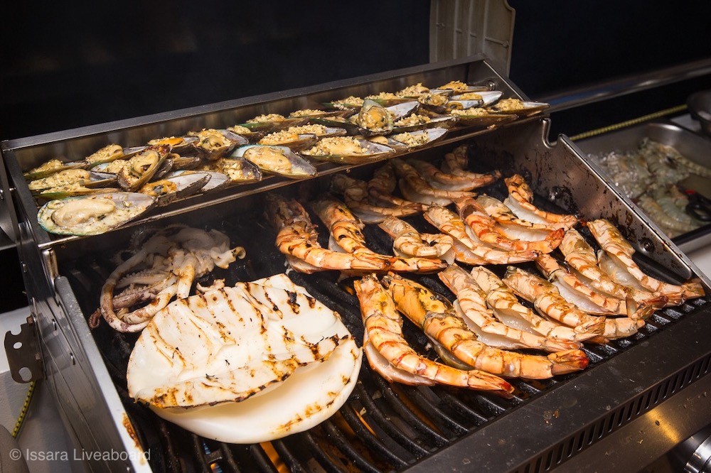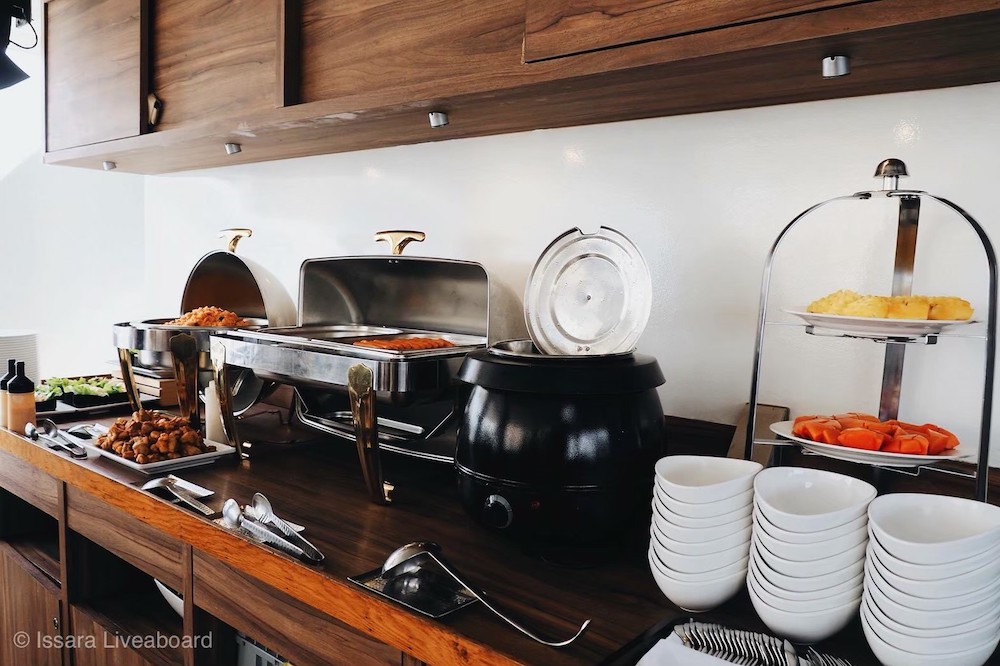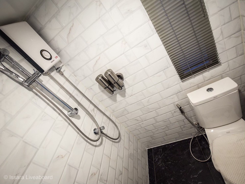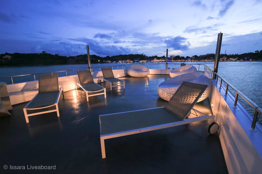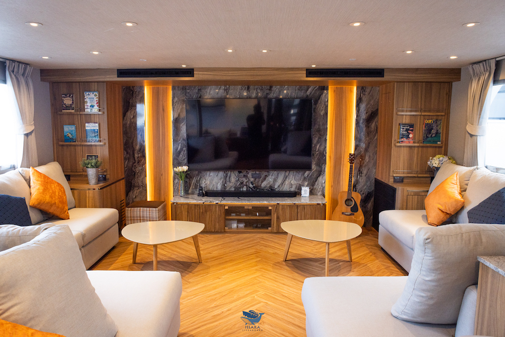 イッサラは全長28メートル、22名定員の大型クルーズ船です。船内は、エアコンサルーン、オープンエアデッキ、サンデッキなど広々とした共有スペースを確保。清潔感のある室内はすべてトイレ・シャワールームを完備しています。一般的なダイビング設備に加え、ナイトロックスタンク充填設備も完備しています。最新のスターリンク(衛星インターネット)を搭載しており、洋上でも安定した通信環境が利用可能です(有料)。
