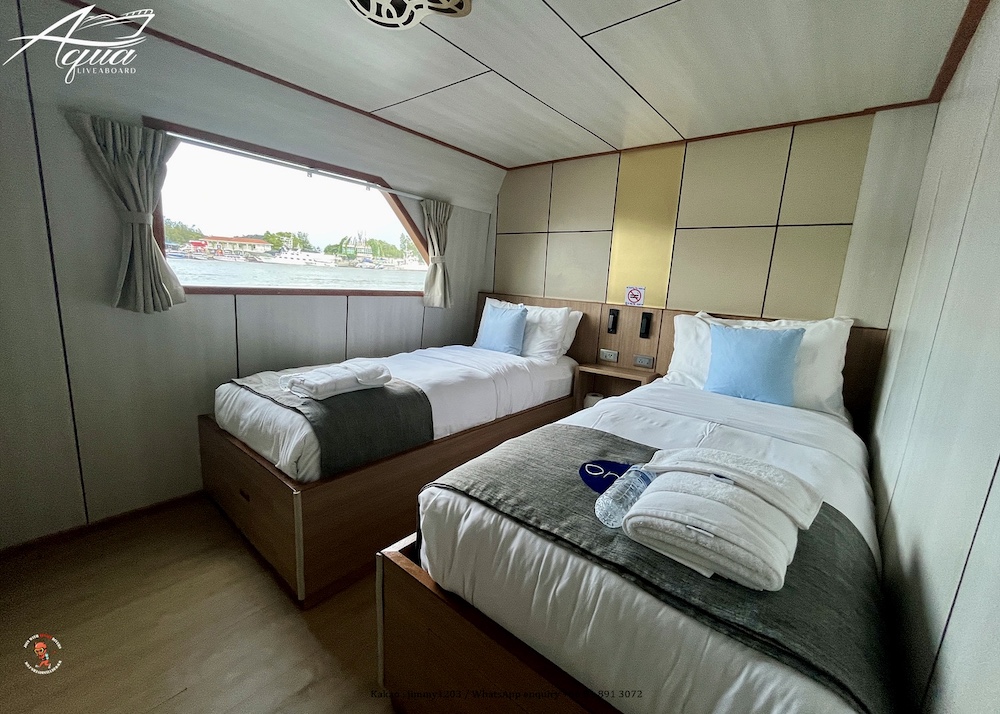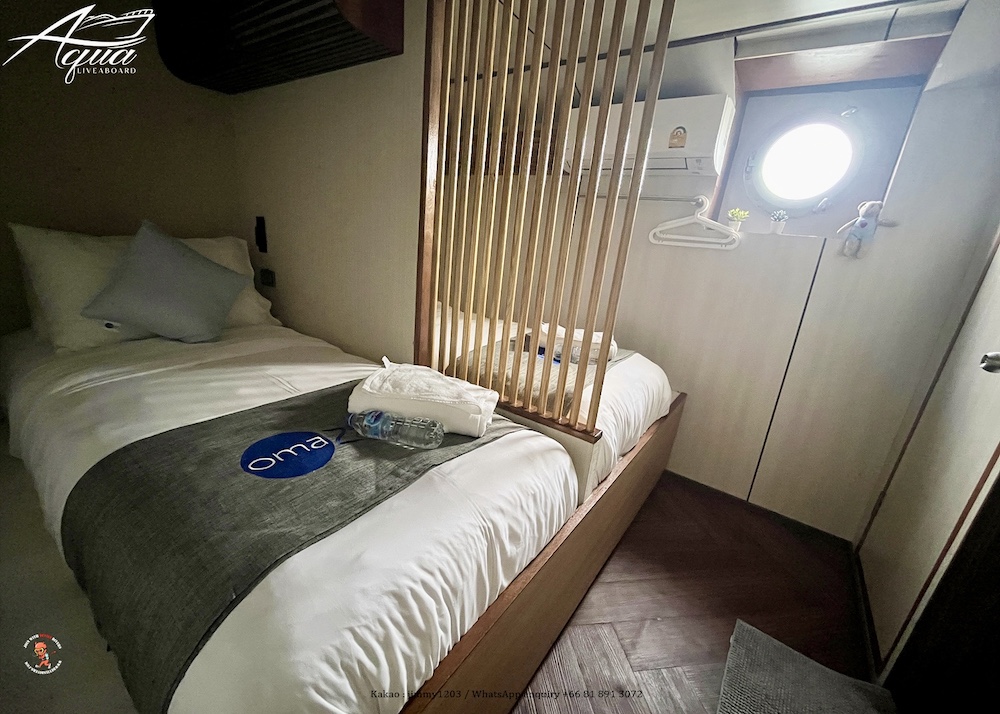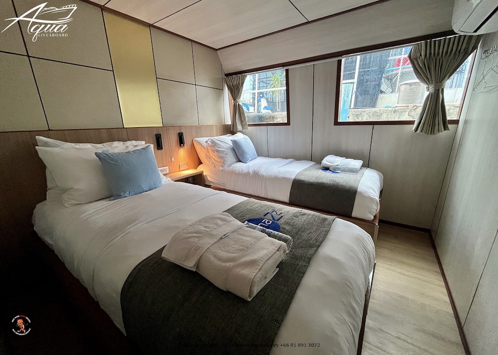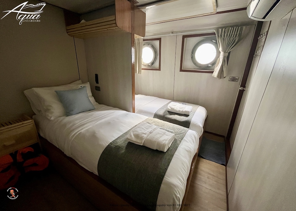 アクアは全長28メートル、最大24名定員の大型クルーズ船です。船内は、エアコンサロン、オープンエアデッキ、サンデッキなど広々とした共有スペースを確保。シンプルながら使いやすくデザインされた客室は快適そのもの、全室内にトイレ、シャワーが完備されています。一般的なダイビング設備に加え、ナイトロックスタンク充填設備も完備していますので、ライセンス保持者の方は無料でご利用いただけます(船上で講習も可)。