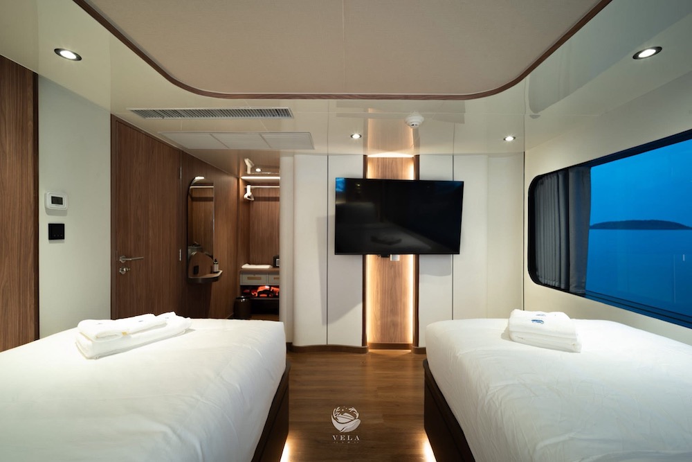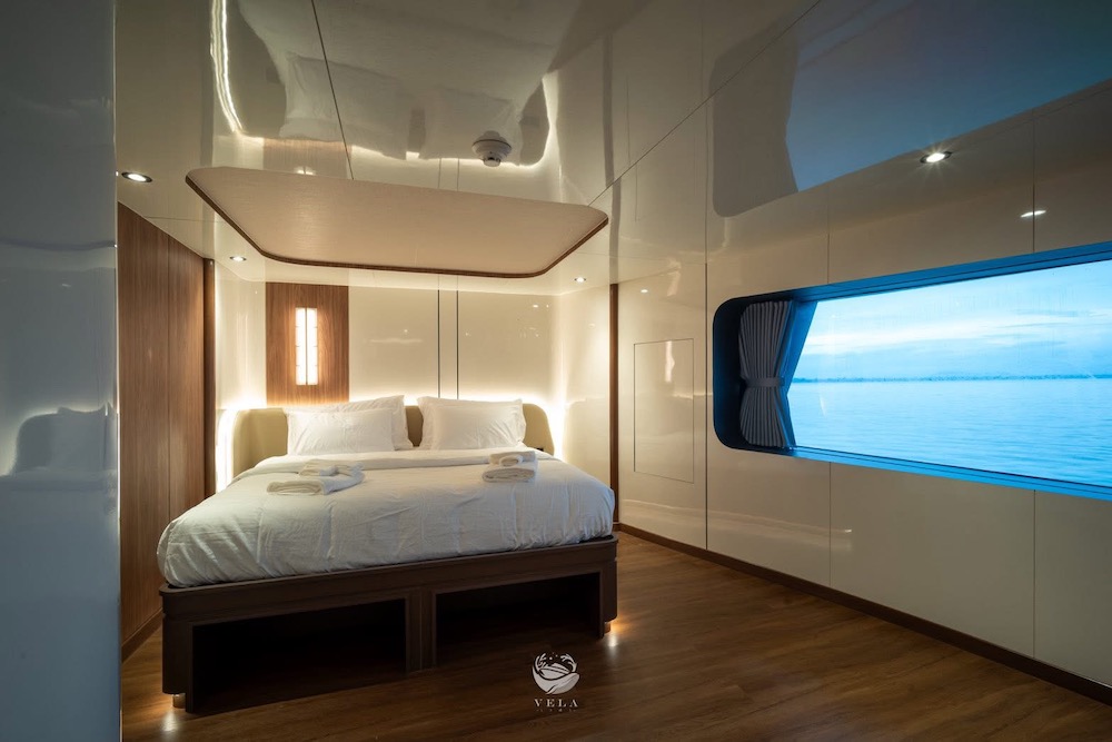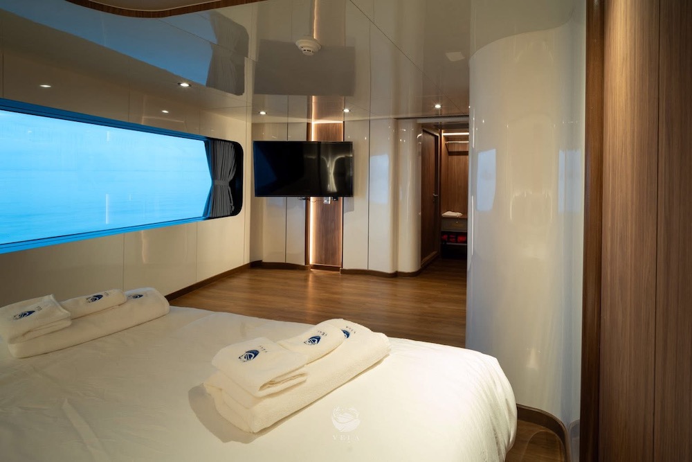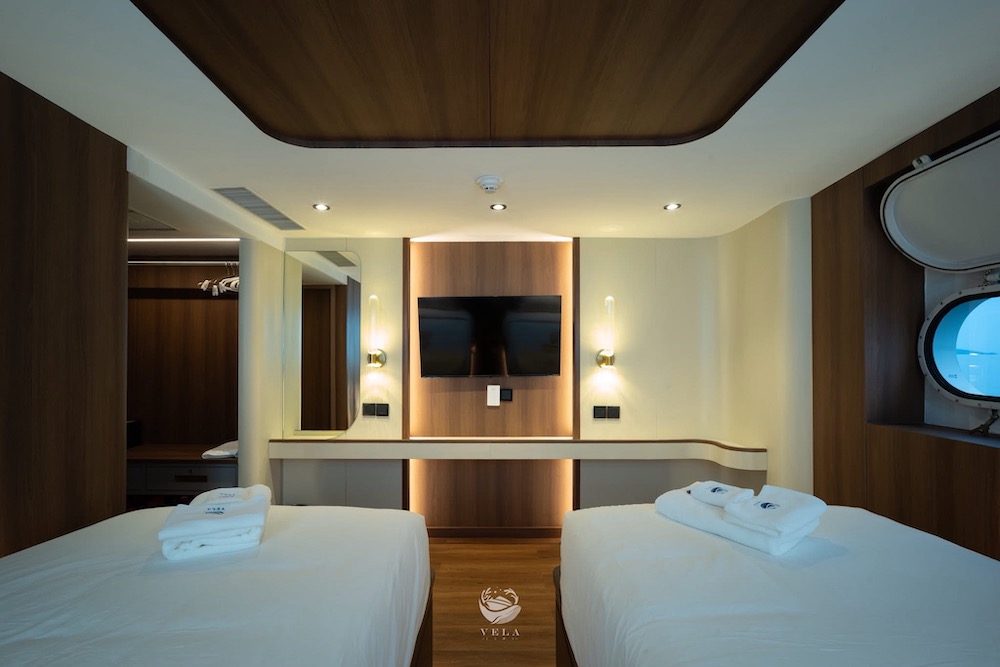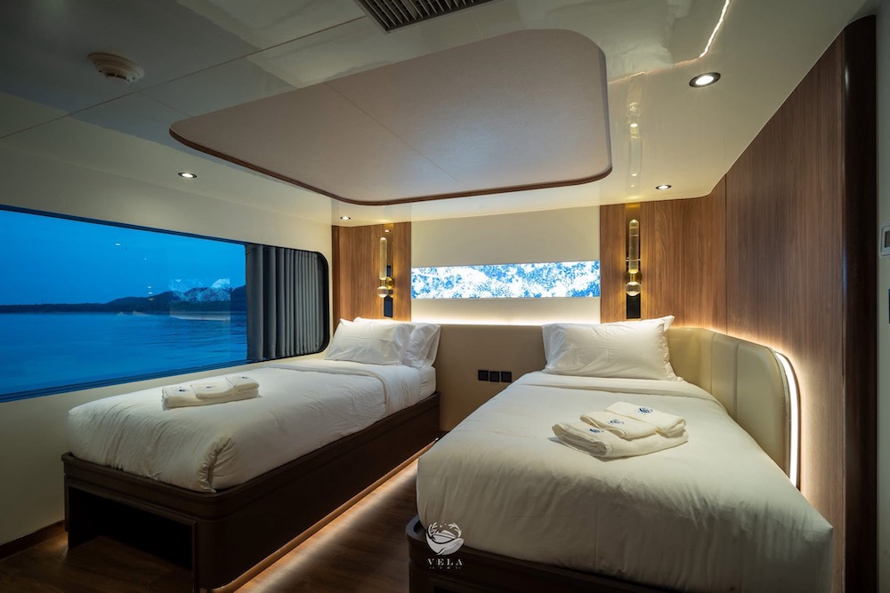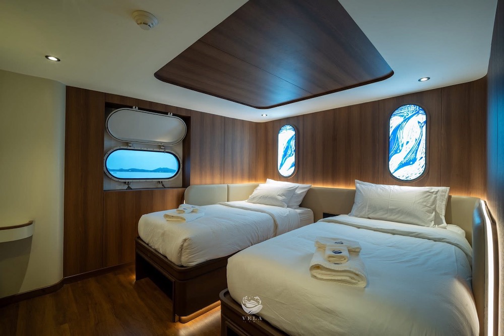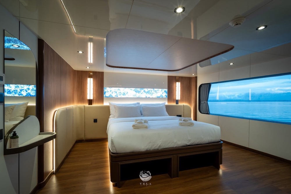 ベラは、2025年に完成、最新鋭のスタイリッシュな大型クルーズ船。船内にはパノラマラウンジや広々としたオープンデッキを備え、ゆったりとくつろげる共有スペースが充実。3タイプのキャビンは全て専用トイレ・温水シャワー、明るい自然光が差し込む窓が完備されています。ナイトロックス充填設備を無料で利用できるほか、カメラ専用ステーションやSUP、シーカヤックなど多彩なアクティビティも楽しめます。